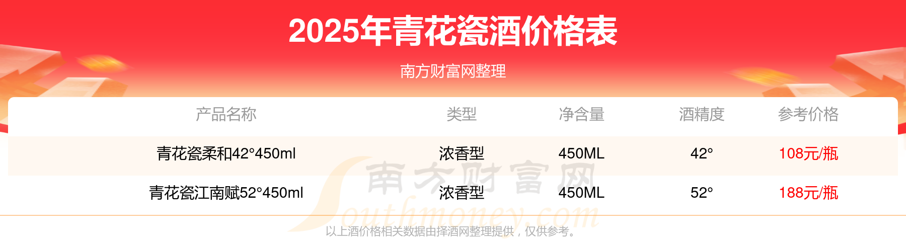 青花瓷江南賦52°450ml參考價188元/瓶、青花瓷柔和42°450ml參考價108元/瓶。