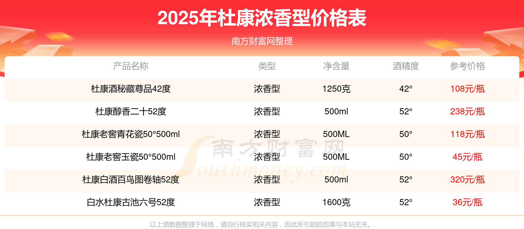 杜康濃香型酒最新價(jià)格2025:杜康白酒百鳥圖卷軸52度參考價(jià)320元/瓶、杜康醇香二十52度參考價(jià)238元/瓶、杜康老窖青花瓷50°500ml參考價(jià)118元/瓶、杜康酒秘藏尊品42度參考價(jià)108元/瓶、杜康老窖玉瓷50°500ml參考價(jià)45元/瓶、白水杜康古池六號(hào)52度參考價(jià)36元/瓶。
