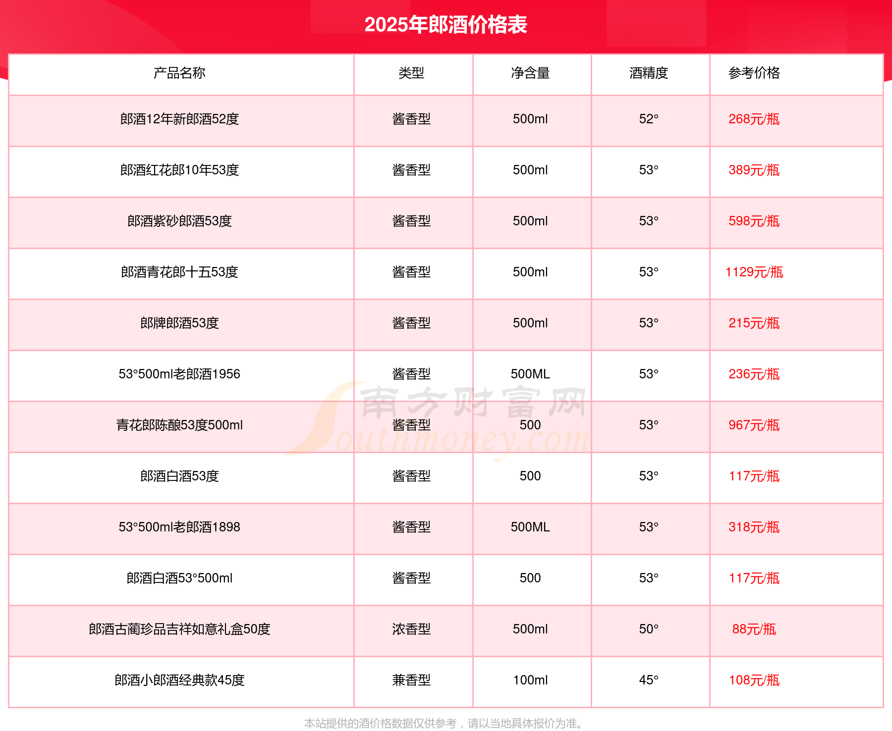 郎酒青花郎十五53度參考價1129元/瓶、青花郎陳釀53度500ml參考價967元/瓶、郎酒紫砂郎酒53度參考價598元/瓶、郎酒紅花郎10年53度參考價389元/瓶、53°500ml老郎酒1898參考價318元/瓶。