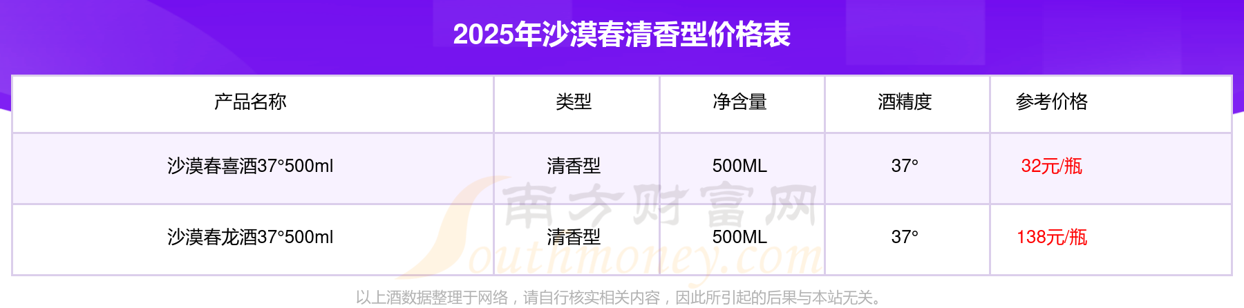 2025年沙漠春清香型酒沙漠春龍酒37°500ml、沙漠春喜酒37°500ml等最新價(jià)格如下:
