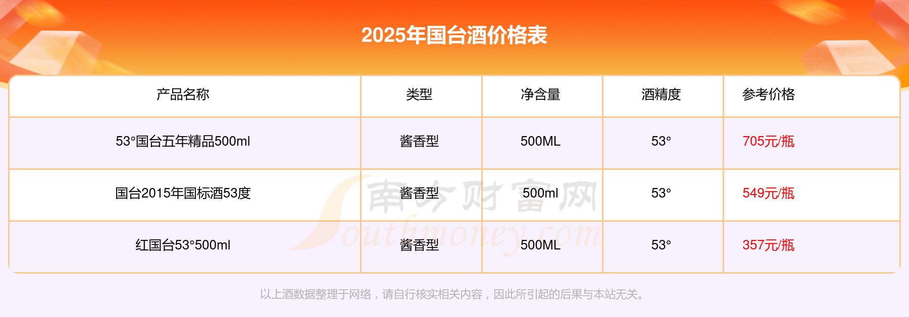 國臺(tái)酒最新價(jià)格2025:53°國臺(tái)五年精品500ml參考價(jià)705元/瓶、國臺(tái)2015年國標(biāo)酒53度參考價(jià)549元/瓶、紅國臺(tái)53°500ml參考價(jià)357元/瓶。