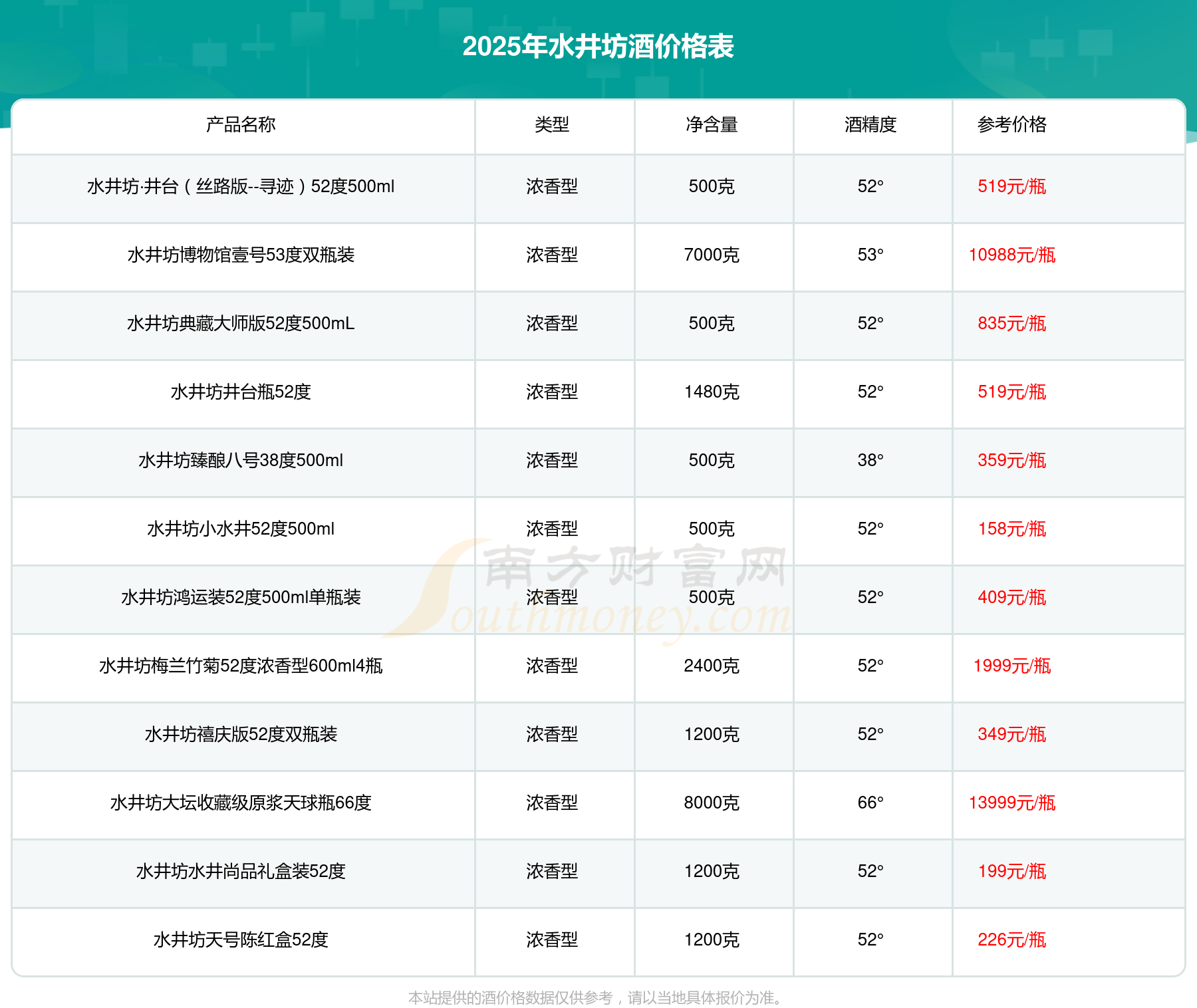2025年,水井坊大壇收藏級原漿天球瓶66度、水井坊博物館壹號53度雙瓶裝、53°水井坊公元十三600ml、水井坊梅蘭竹菊52度濃香型600ml4瓶、水井坊菁翠52度500ml、井臺珍藏版龍53度1000ml單瓶裝、井臺珍藏版鳳53度1000ml單瓶裝等水井坊酒價格如下:水井坊大壇收藏級原漿天球瓶66度參考價13999元/瓶、水井坊博物館壹號53度雙瓶裝參考價10988元/瓶、53°水井坊公元十三600ml參考價2580元/瓶、水井坊梅蘭竹菊52度濃香型600ml4瓶參考價1999元/瓶、水井坊菁翠52度500ml參考價1650元/瓶、井臺珍藏版龍53度1000ml單瓶裝參考價1298元/瓶、井臺珍藏版鳳53度1000ml單瓶裝參考價1298元/瓶。