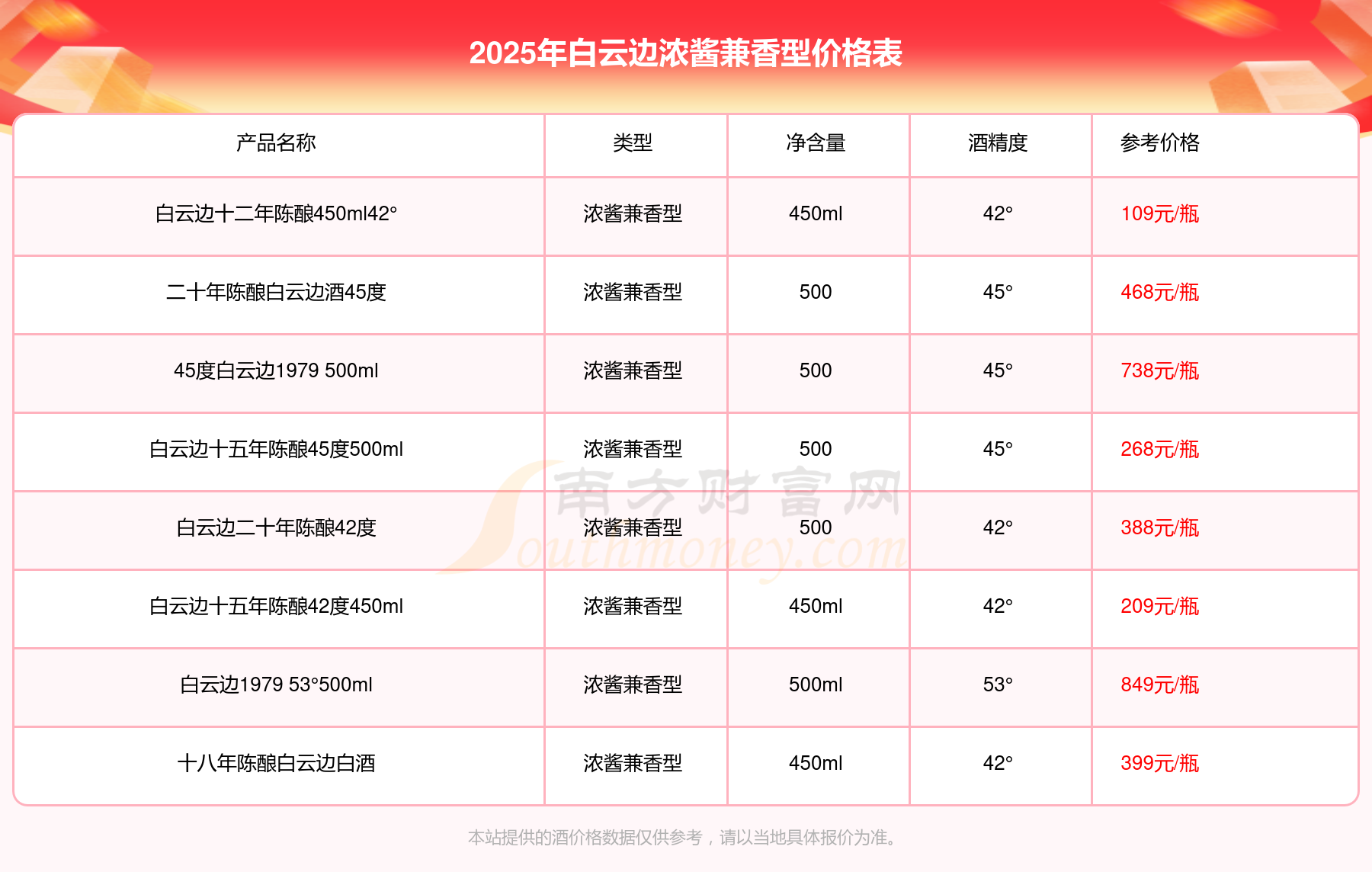 2025白云邊濃醬兼香型酒最新價格:白云邊1979 53°500ml參考價849元/瓶、45度白云邊1979 500ml參考價738元/瓶、二十年陳釀白云邊酒45度參考價468元/瓶、十八年陳釀白云邊白酒參考價399元/瓶、白云邊二十年陳釀42度參考價388元/瓶、白云邊十五年陳釀45度500ml參考價268元/瓶、白云邊十五年陳釀42度450ml參考價209元/瓶。