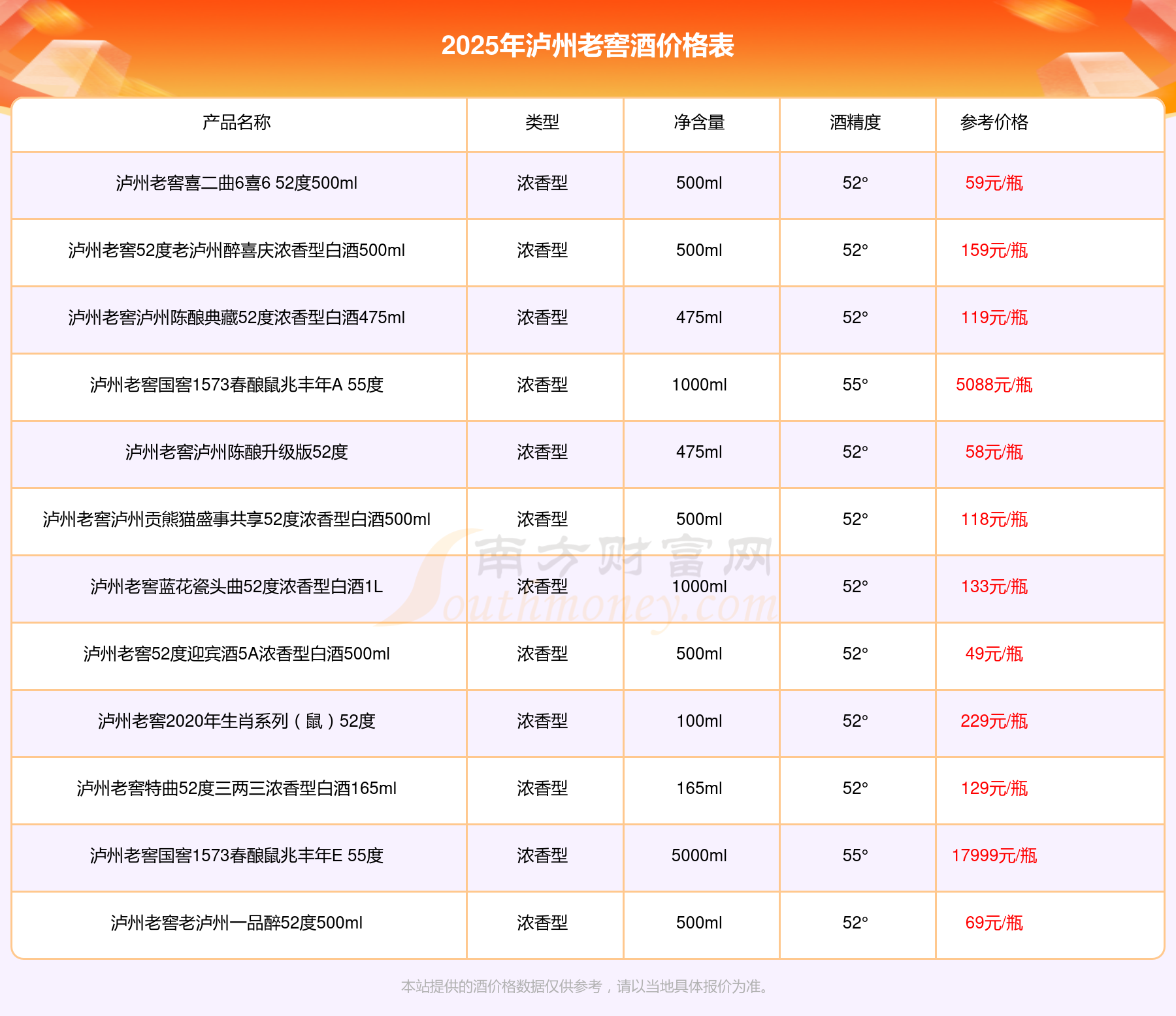 2025年,瀘州老窖酒價(jià)格最高的是瀘州老窖國窖1573春釀鼠兆豐年E 55度,參考價(jià)17999元,最低的是瀘州老窖45度五洲醉8窖經(jīng)典小酒版濃香型100ml,參考價(jià)10元,價(jià)格高低差為17989元。