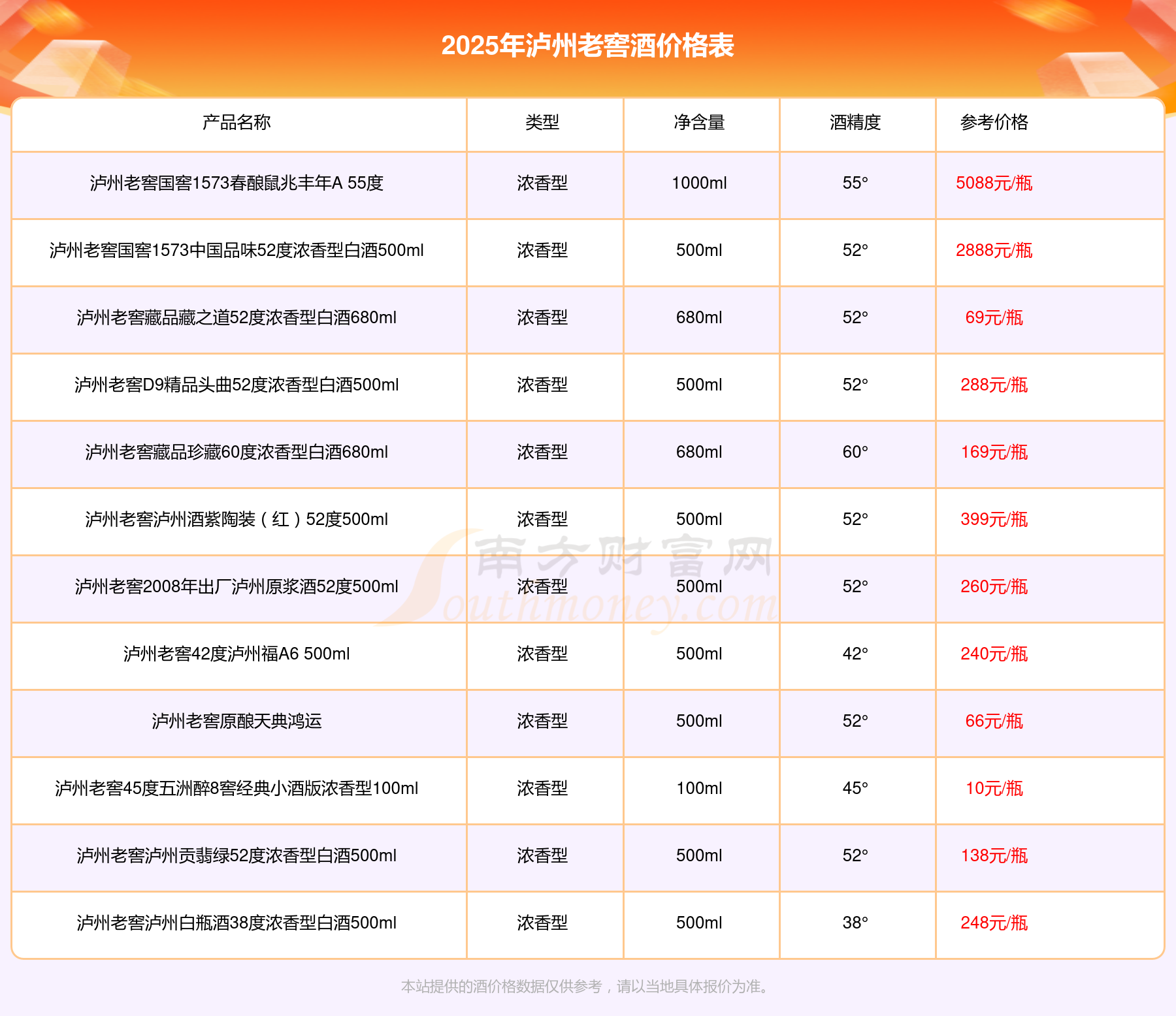 2025年,瀘州老窖國窖1573春釀鼠兆豐年E 55度、瀘州老窖國窖1573生命中的那壇酒55度014、瀘州老窖國窖1573春釀鼠兆豐年A 55度、瀘州老窖國窖1573生命中的那壇酒55度013濃香型白酒1000ml、瀘州老窖國窖1573生命中的那壇酒55度009 1000ml、瀘州老窖國窖1573中國品味52度濃香型白酒500ml、瀘州老窖國窖1573許燎源概念作品58度濃香型白酒1000ml、瀘州老窖52度國窖1573狗年生肖禮盒等瀘州老窖酒價格如下:瀘州老窖國窖1573春釀鼠兆豐年E 55度參考價17999元/瓶、瀘州老窖國窖1573生命中的那壇酒55度014參考價9999元/瓶、瀘州老窖國窖1573春釀鼠兆豐年A 55度參考價5088元/瓶、瀘州老窖國窖1573生命中的那壇酒55度013濃香型白酒1000ml參考價4988元/瓶、瀘州老窖國窖1573生命中的那壇酒55度009 1000ml參考價4288元/瓶、瀘州老窖國窖1573中國品味52度濃香型白酒500ml參考價2888元/瓶、瀘州老窖國窖1573許燎源概念作品58度濃香型白酒1000ml參考價2680元/瓶、瀘州老窖52度國窖1573狗年生肖禮盒參考價2143元/瓶。