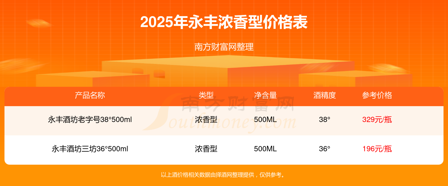 2025年,永豐酒坊老字號(hào)38°500ml、永豐酒坊三坊36°500ml等永豐濃香型酒價(jià)格如下:永豐酒坊老字號(hào)38°500ml參考價(jià)329元/瓶、永豐酒坊三坊36°500ml參考價(jià)196元/瓶。