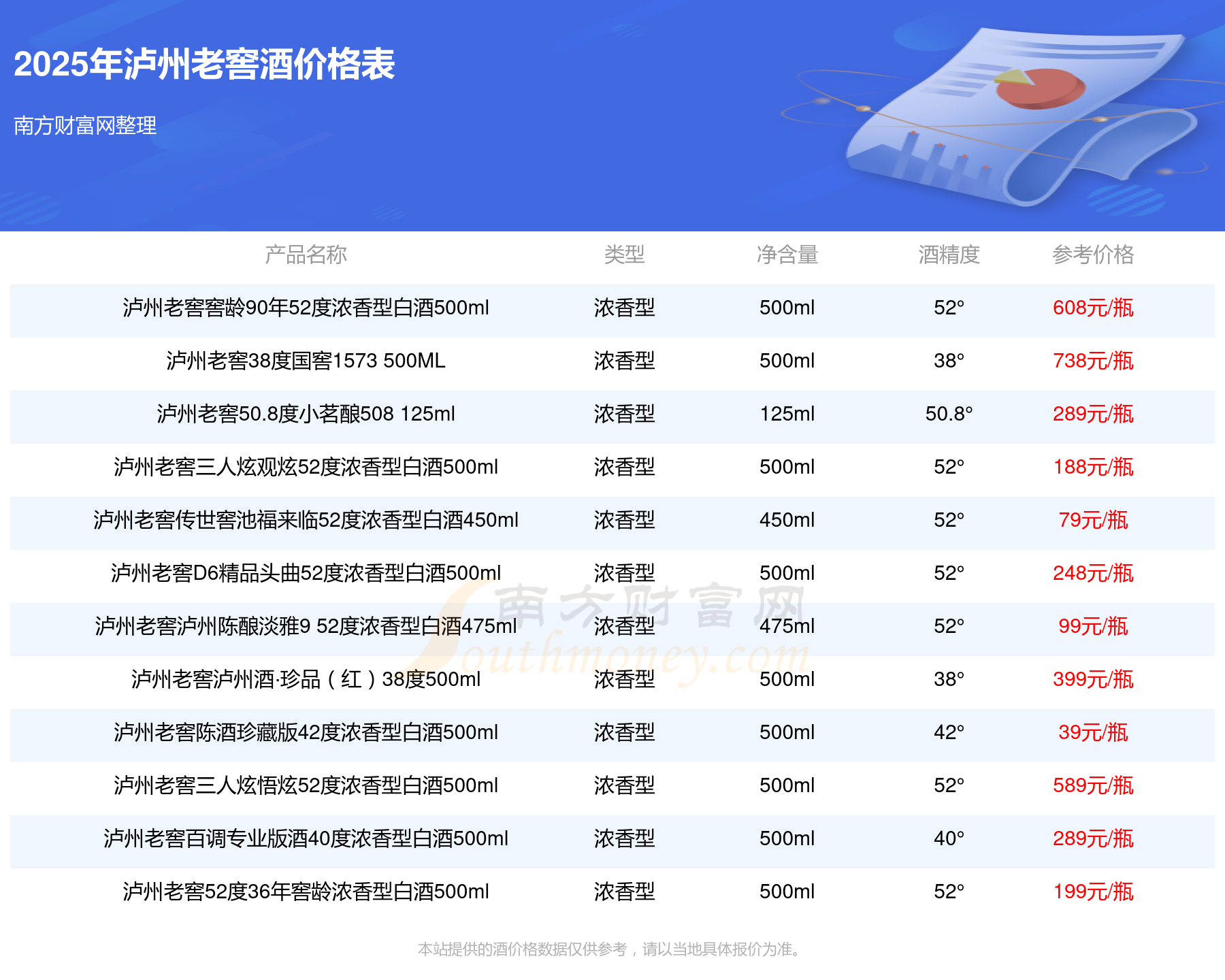 2025瀘州老窖酒最新價(jià)格:瀘州老窖國窖1573春釀鼠兆豐年E 55度參考價(jià)17999元/瓶、瀘州老窖國窖1573生命中的那壇酒55度014參考價(jià)9999元/瓶、瀘州老窖國窖1573春釀鼠兆豐年A 55度參考價(jià)5088元/瓶、瀘州老窖國窖1573生命中的那壇酒55度013濃香型白酒1000ml參考價(jià)4988元/瓶、瀘州老窖國窖1573生命中的那壇酒55度009 1000ml參考價(jià)4288元/瓶、瀘州老窖國窖1573中國品味52度濃香型白酒500ml參考價(jià)2888元/瓶、瀘州老窖國窖1573許燎源概念作品58度濃香型白酒1000ml參考價(jià)2680元/瓶。