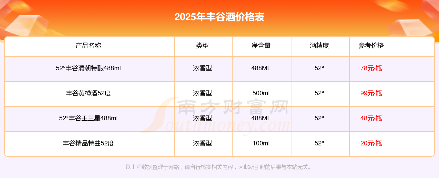 2025年,豐谷黃樽酒52度、52°豐谷清朝特釀488ml、52°豐谷王三星488ml、豐谷精品特曲52度等豐谷酒價格如下:豐谷黃樽酒52度參考價99元/瓶、52°豐谷清朝特釀488ml參考價78元/瓶、52°豐谷王三星488ml參考價48元/瓶、豐谷精品特曲52度參考價20元/瓶。