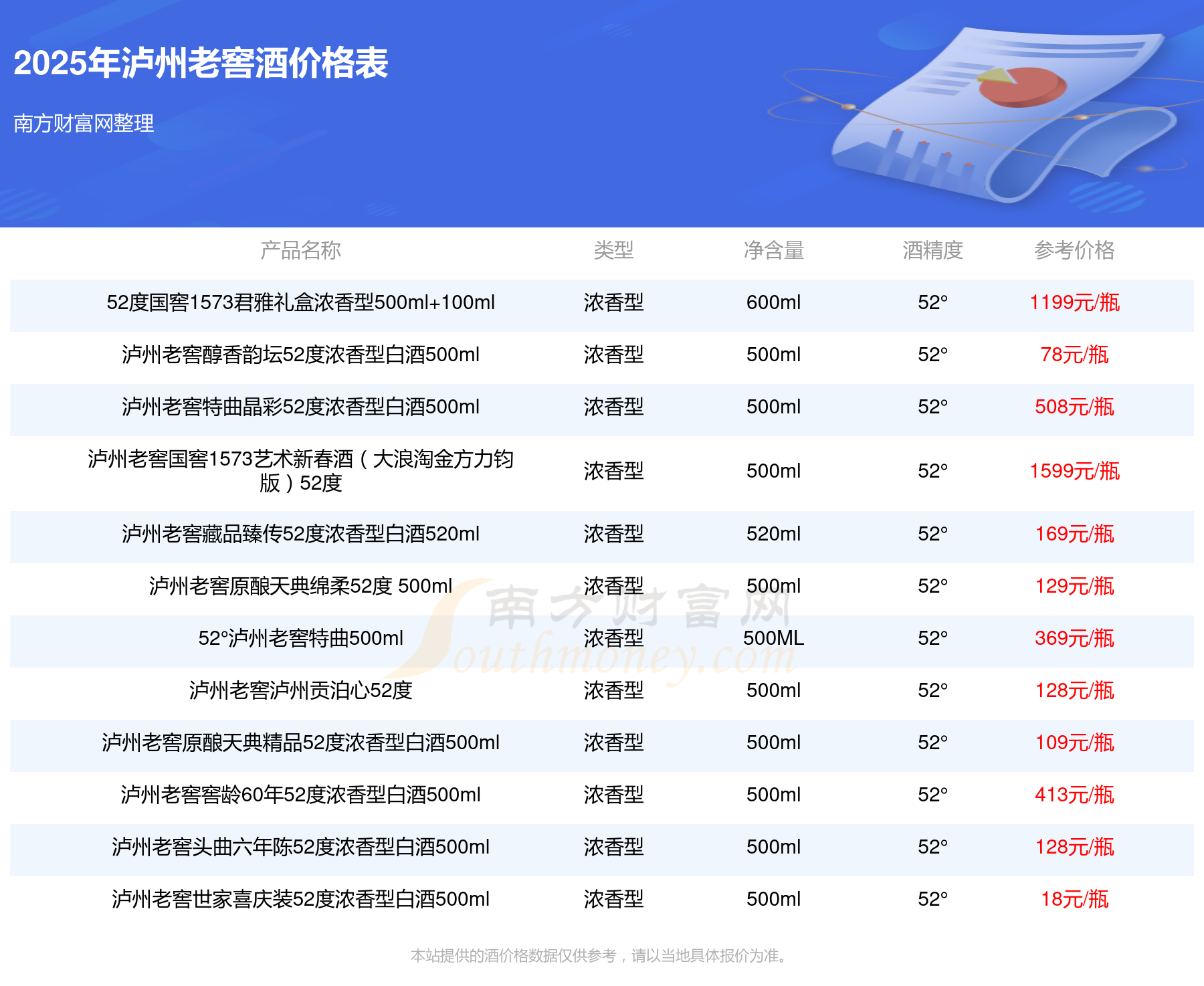 2025年,瀘州老窖國窖1573春釀鼠兆豐年E 55度、瀘州老窖國窖1573生命中的那壇酒55度014、瀘州老窖國窖1573春釀鼠兆豐年A 55度等瀘州老窖酒價格如下:瀘州老窖國窖1573春釀鼠兆豐年E 55度參考價17999元/瓶、瀘州老窖國窖1573生命中的那壇酒55度014參考價9999元/瓶、瀘州老窖國窖1573春釀鼠兆豐年A 55度參考價5088元/瓶。