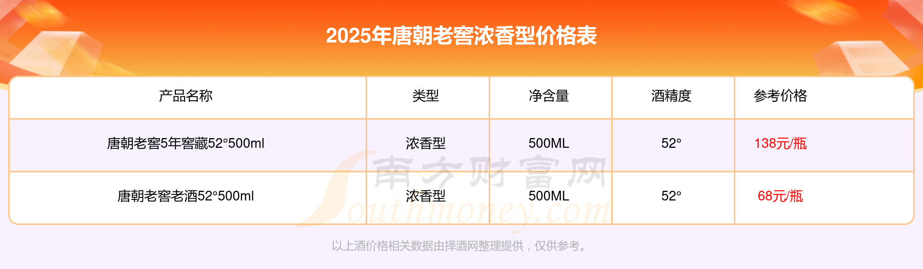 2025年,唐朝老窖5年窖藏52°500ml、唐朝老窖老酒52°500ml等唐朝老窖濃香型酒參考價(jià)格如下:唐朝老窖5年窖藏52°500ml參考價(jià)138元、唐朝老窖老酒52°500ml參考價(jià)68元。