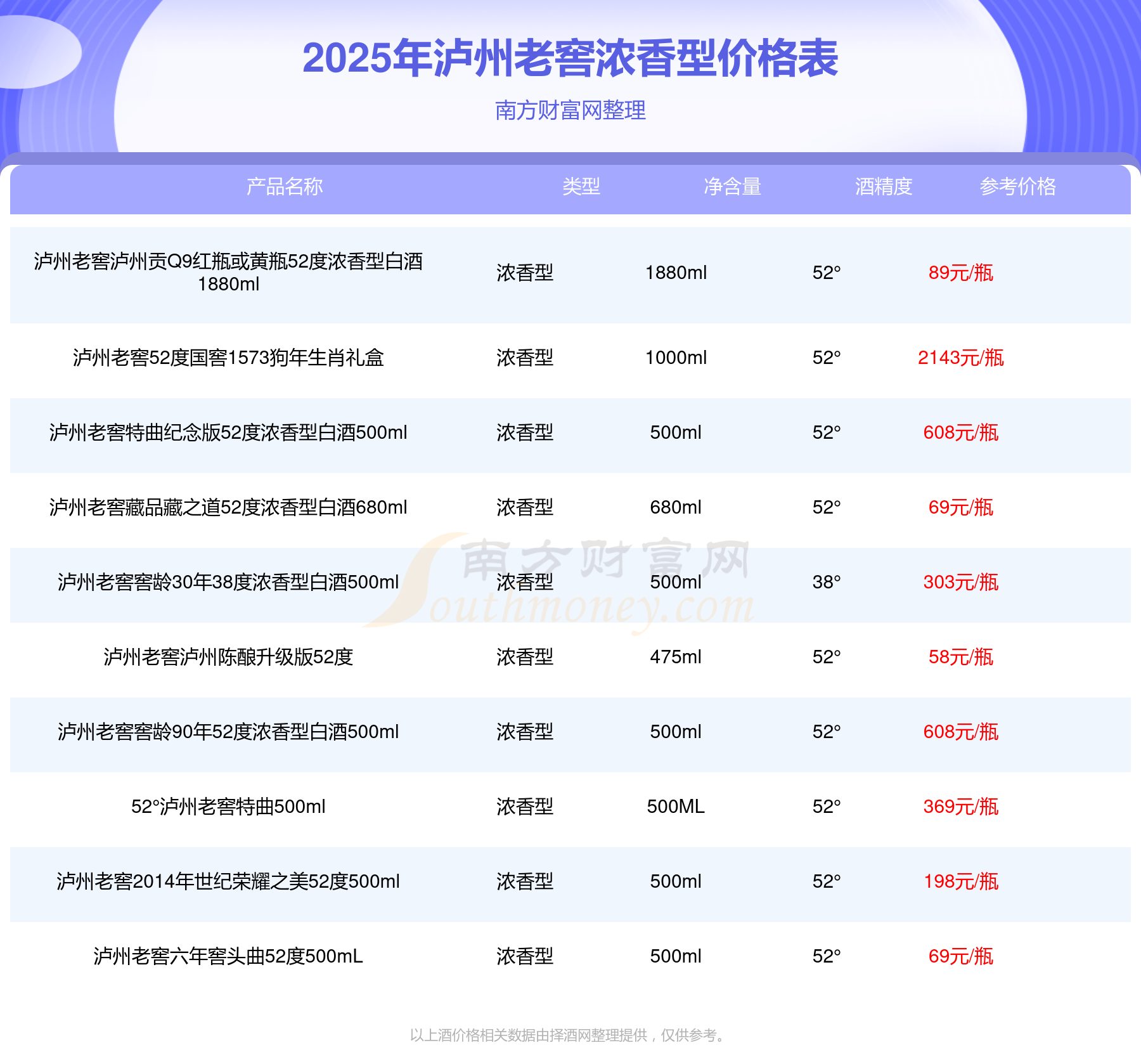 2025瀘州老窖濃香型酒最新價格:瀘州老窖國窖1573春釀鼠兆豐年E 55度參考價17999元/瓶、瀘州老窖國窖1573生命中的那壇酒55度014參考價9999元/瓶、瀘州老窖國窖1573春釀鼠兆豐年A 55度參考價5088元/瓶、瀘州老窖國窖1573生命中的那壇酒55度013濃香型白酒1000ml參考價4988元/瓶、瀘州老窖國窖1573生命中的那壇酒55度009 1000ml參考價4288元/瓶、瀘州老窖國窖1573中國品味52度濃香型白酒500ml參考價2888元/瓶、瀘州老窖國窖1573許燎源概念作品58度濃香型白酒1000ml參考價2680元/瓶、瀘州老窖52度國窖1573狗年生肖禮盒參考價2143元/瓶。