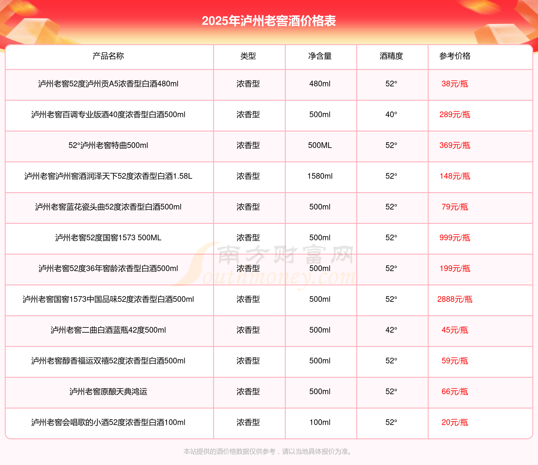 瀘州老窖國窖1573春釀鼠兆豐年E 55度參考價17999元/瓶、瀘州老窖國窖1573生命中的那壇酒55度014參考價9999元/瓶、瀘州老窖國窖1573春釀鼠兆豐年A 55度參考價5088元/瓶、瀘州老窖國窖1573生命中的那壇酒55度013濃香型白酒1000ml參考價4988元/瓶、瀘州老窖國窖1573生命中的那壇酒55度009 1000ml參考價4288元/瓶、瀘州老窖國窖1573中國品味52度濃香型白酒500ml參考價2888元/瓶、瀘州老窖國窖1573許燎源概念作品58度濃香型白酒1000ml參考價2680元/瓶。