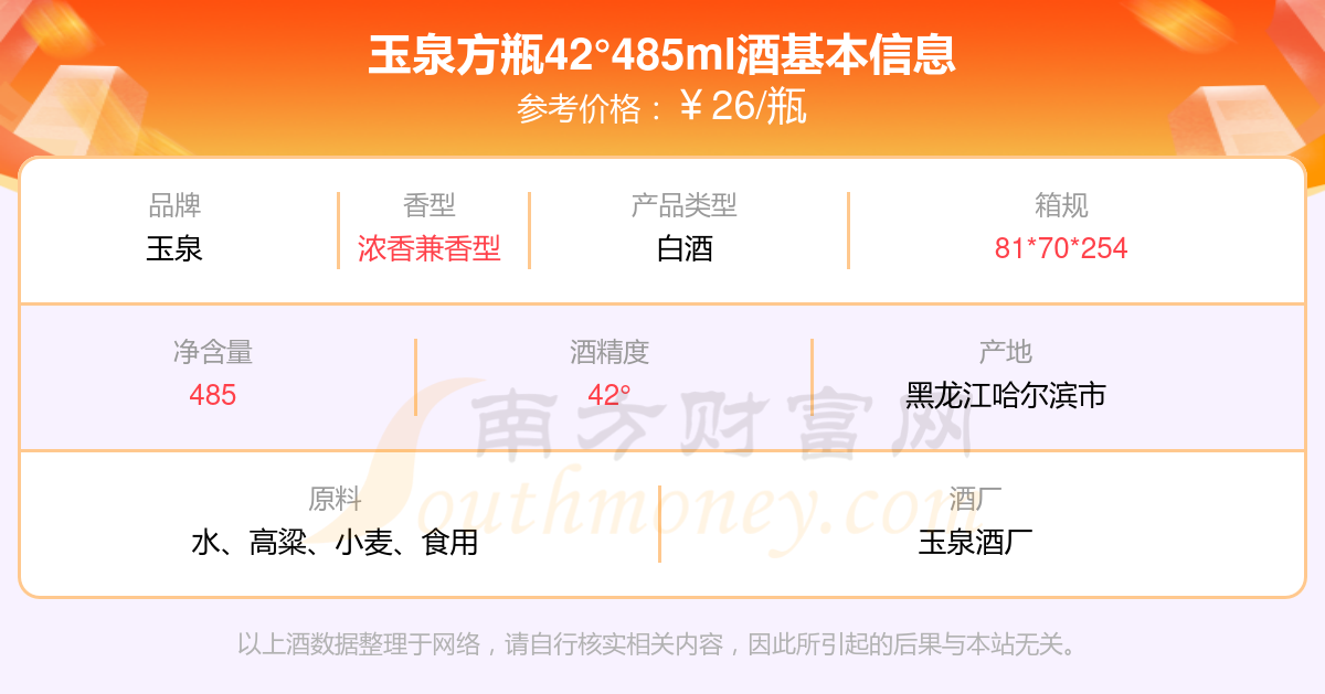 玉泉方瓶42°485ml基本信息