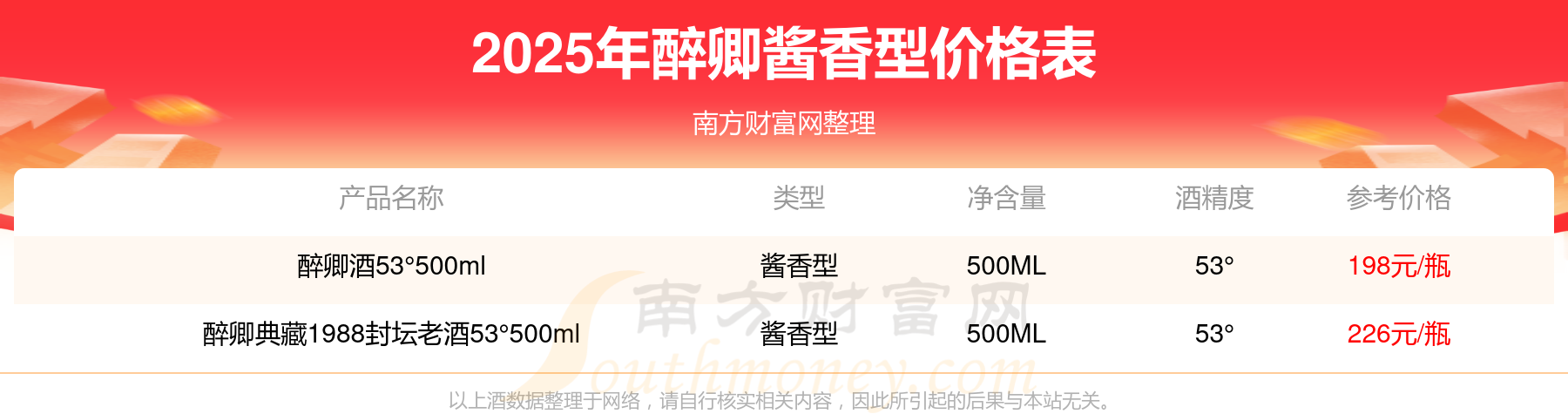 醉卿醬香型酒最新價(jià)格2025:醉卿典藏1988封壇老酒53°500ml參考價(jià)226元/瓶、醉卿酒53°500ml參考價(jià)198元/瓶。