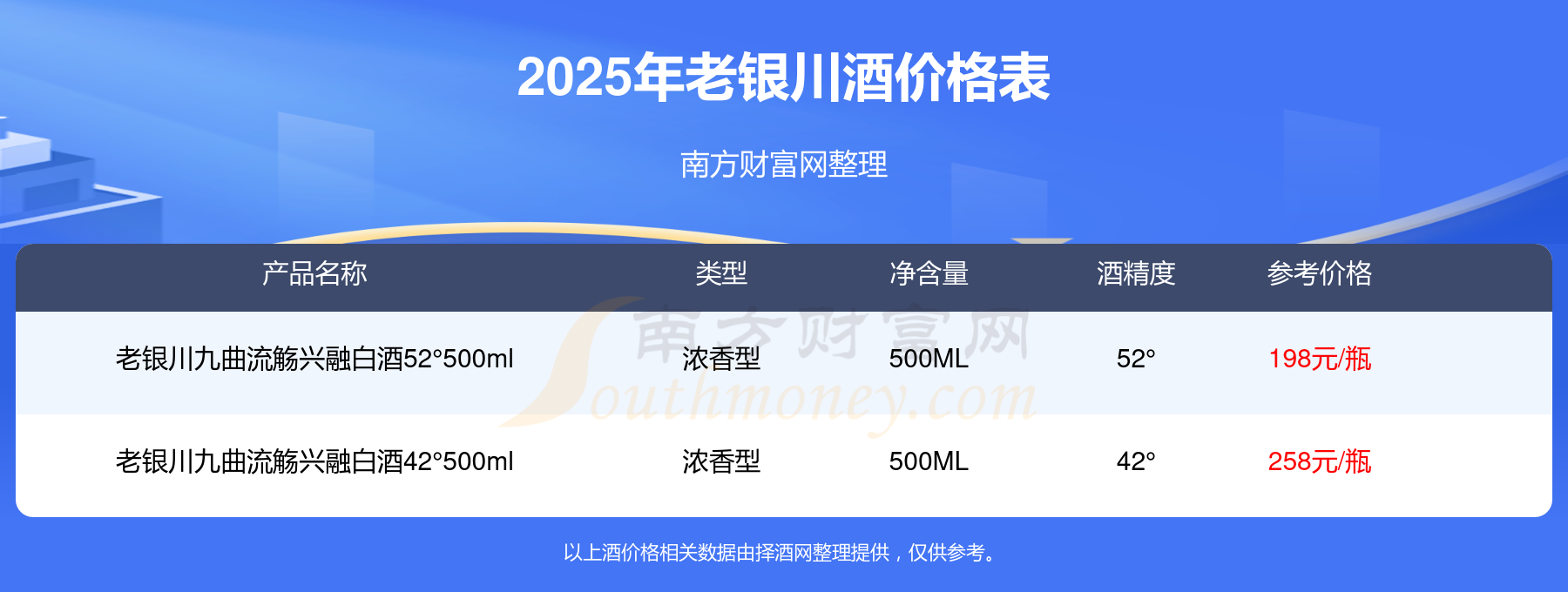 2025年,老銀川九曲流觴興融白酒42°500ml、老銀川九曲流觴興融白酒52°500ml等老銀川酒價(jià)格如下:老銀川九曲流觴興融白酒42°500ml參考價(jià)258元/瓶、老銀川九曲流觴興融白酒52°500ml參考價(jià)198元/瓶。