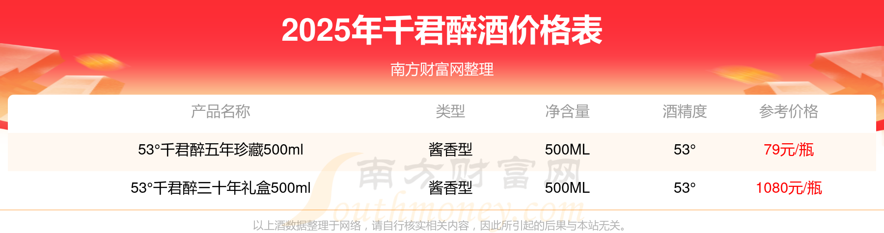 2025年,53°千君醉三十年禮盒500ml、53°千君醉五年珍藏500ml等千君醉酒價(jià)格如下:53°千君醉三十年禮盒500ml參考價(jià)1080元/瓶、53°千君醉五年珍藏500ml參考價(jià)79元/瓶。