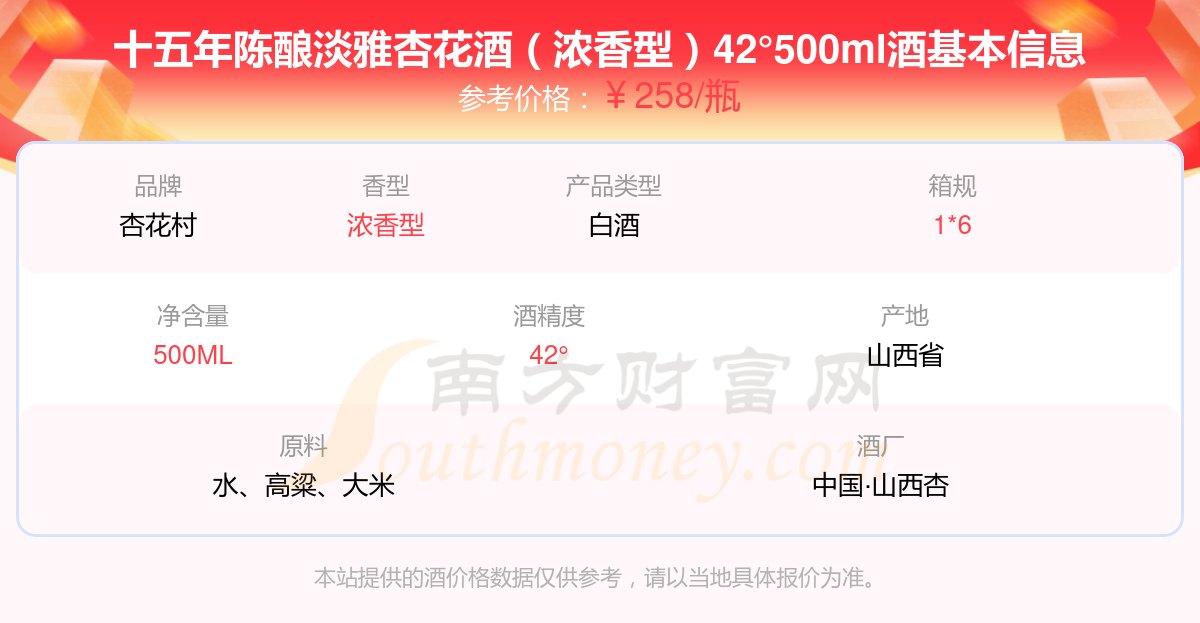 十五年陳釀淡雅杏花酒(濃香型)42°500ml基本信息