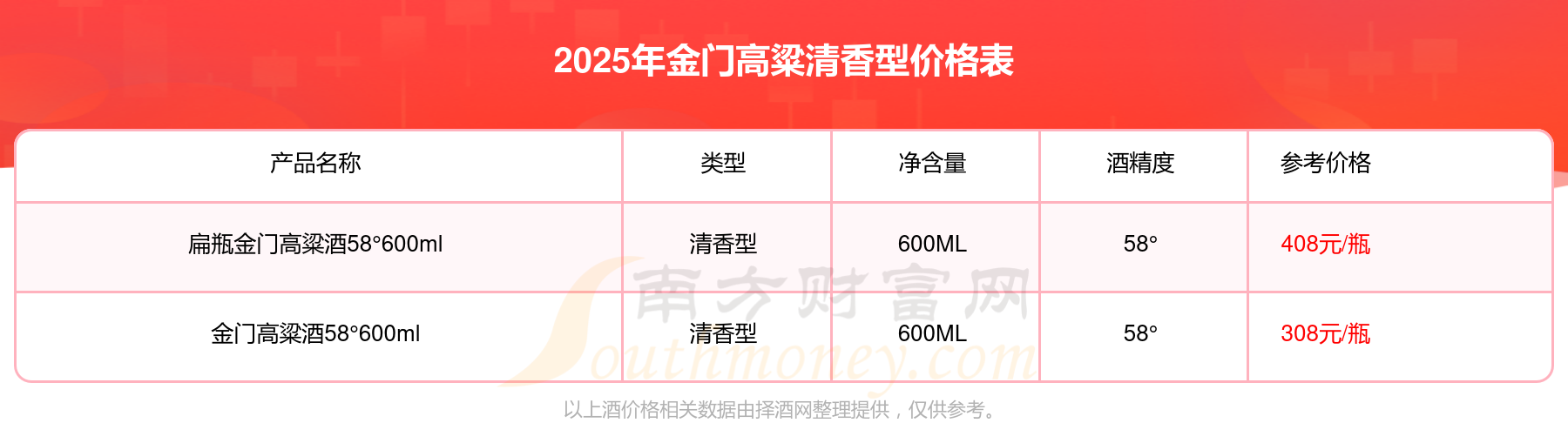2025年金門高粱清香型價(jià)格最高的酒是扁瓶金門高粱酒58°600ml,參考價(jià)408元/瓶,最低的是金門高粱酒58°600ml,參考價(jià)308元/瓶,價(jià)格高低差為100元/瓶。