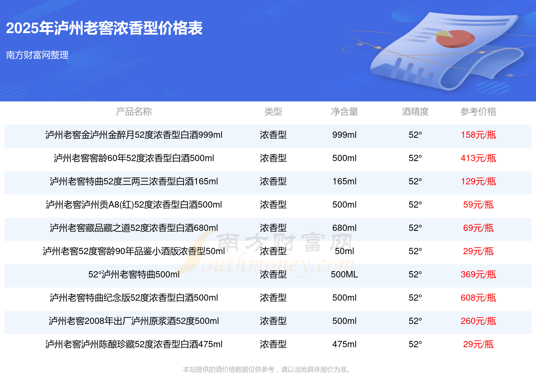 2025瀘州老窖濃香型酒最新價格:瀘州老窖國窖1573春釀鼠兆豐年E 55度參考價17999元/瓶、瀘州老窖國窖1573生命中的那壇酒55度014參考價9999元/瓶、瀘州老窖國窖1573春釀鼠兆豐年A 55度參考價5088元/瓶、瀘州老窖國窖1573生命中的那壇酒55度013濃香型白酒1000ml參考價4988元/瓶、瀘州老窖國窖1573生命中的那壇酒55度009 1000ml參考價4288元/瓶、瀘州老窖國窖1573中國品味52度濃香型白酒500ml參考價2888元/瓶。