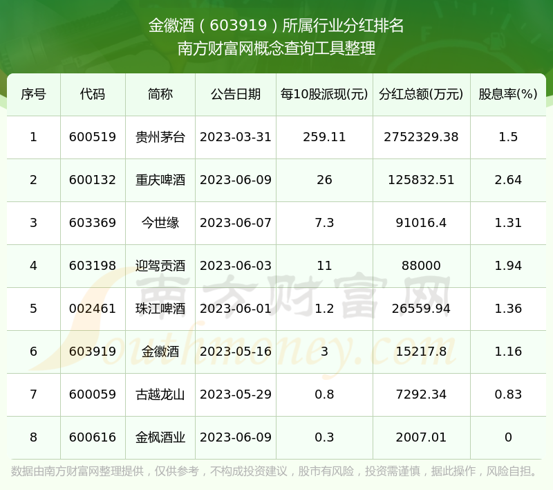 一、金徽酒(603919)股票分紅記錄 金徽酒最新一次公布的分紅方案為10派3元。本次權(quán)益分派股權(quán)登記日為2023年5月22日,除權(quán)除息日為2023年5月23日,派息日為2023年5月23日。 近年金徽酒