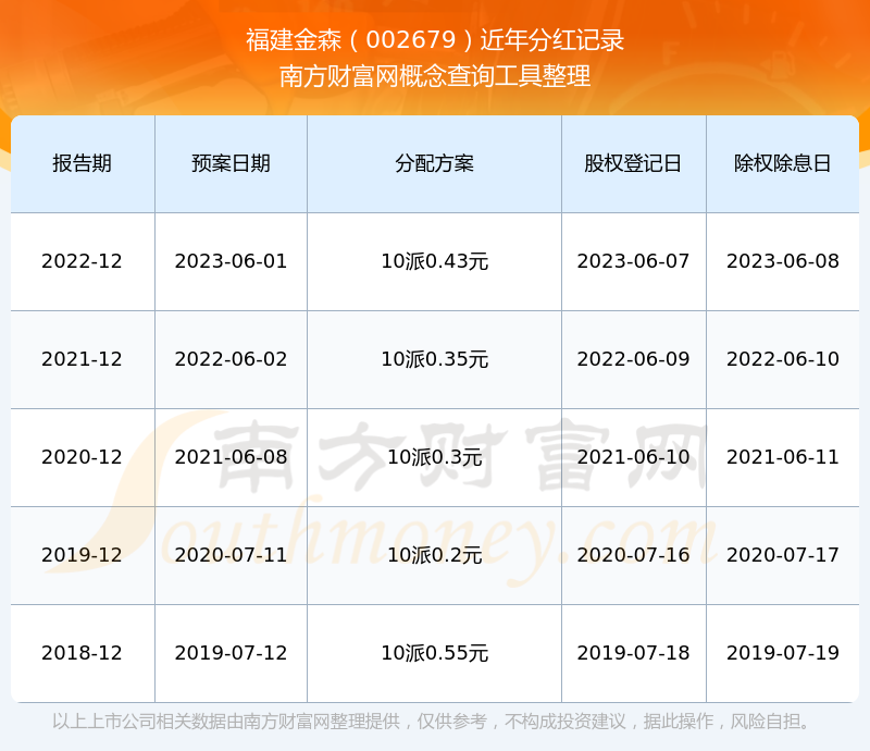 福建金森最新一次公布的分紅方案為10派0.43元。本次權(quán)益分派股權(quán)登記日為2023年6月7日,除權(quán)除息日為2023年6月8日,派息日為2023年6月8日。