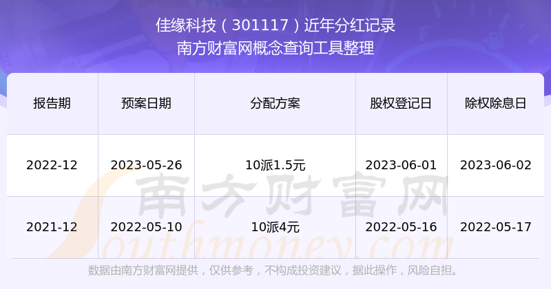 佳緣科技最新一次公布的分紅方案為10派1.5元。本次權(quán)益分派股權(quán)登記日為2023年6月1日,除權(quán)除息日為2023年6月2日,派息日為2023年6月2日。