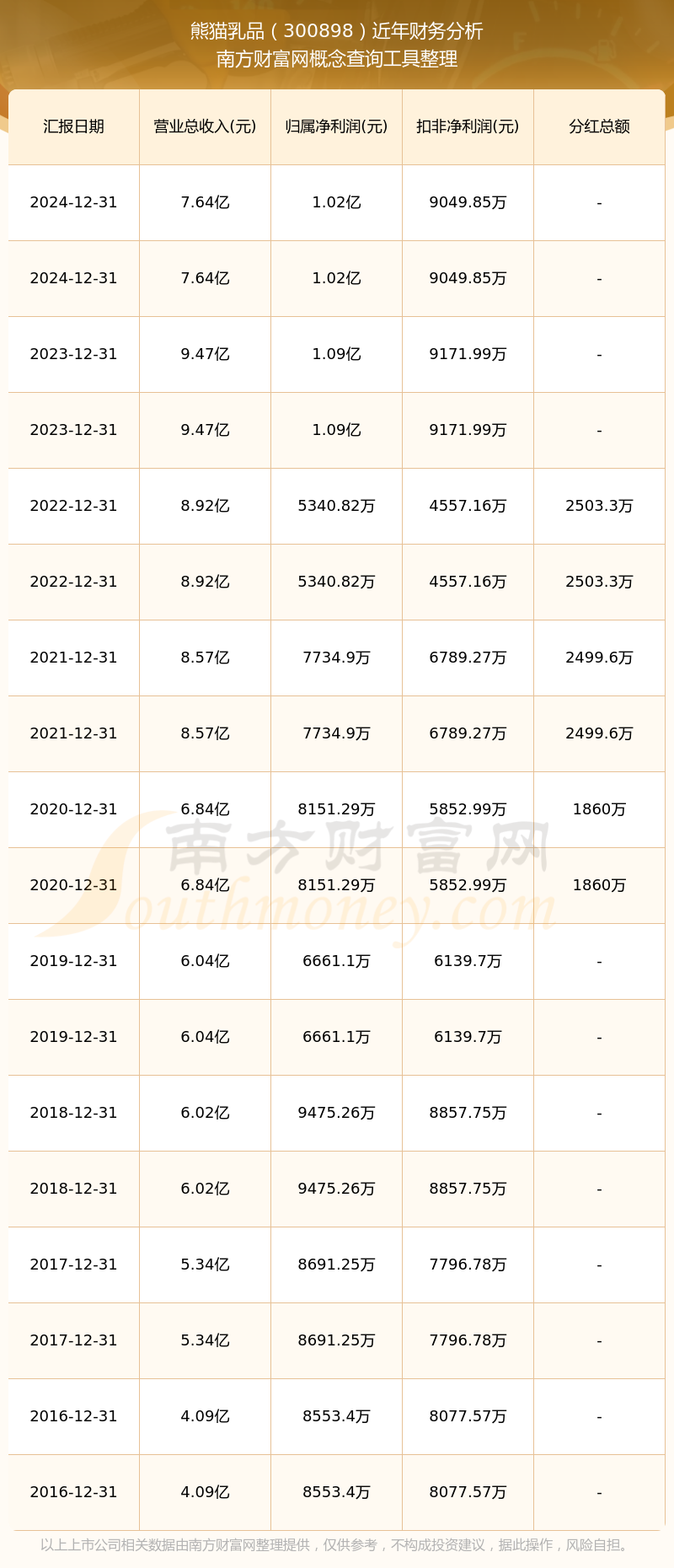 熊貓乳品公司2024年實(shí)現(xiàn)營(yíng)業(yè)收入7.64億元,同比增長(zhǎng)-19.29%;凈利潤(rùn)1.02億元,同比增長(zhǎng)-5.98%;毛利率28.4%。