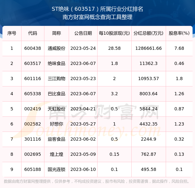 按照南方財(cái)富網(wǎng)趨勢(shì)選股系統(tǒng)統(tǒng)計(jì),ST絕味所屬行業(yè)為食品行業(yè),食品行業(yè)分紅排名情況如下表: