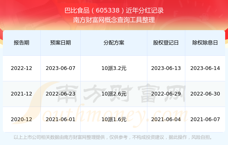 巴比食品最新一次公布的分紅方案:10派3.2元。