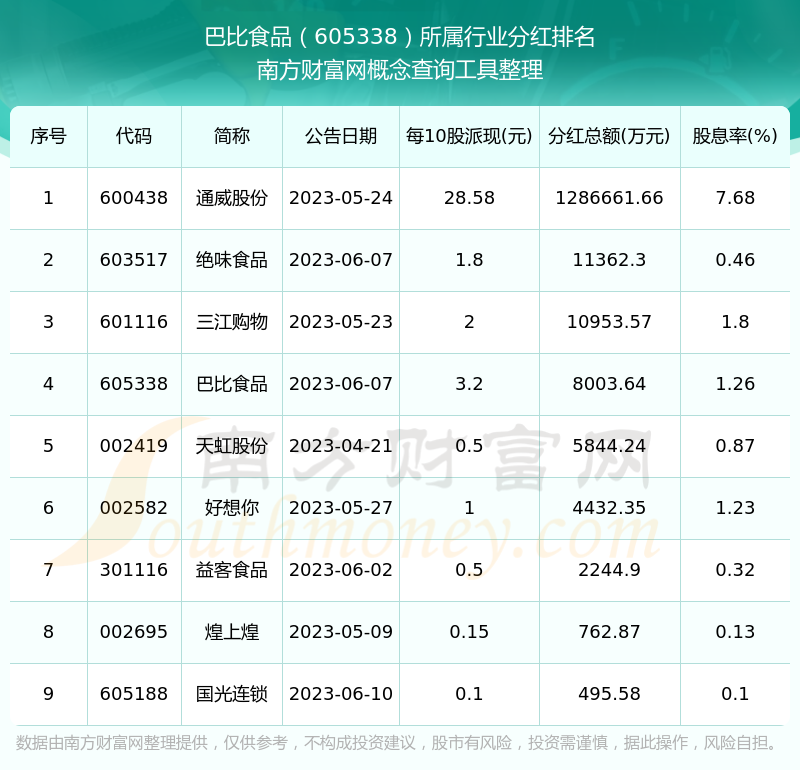按照南方財(cái)富網(wǎng)趨勢(shì)選股系統(tǒng)統(tǒng)計(jì),巴比食品所屬行業(yè)為食品行業(yè),食品行業(yè)分紅排名情況如下表: