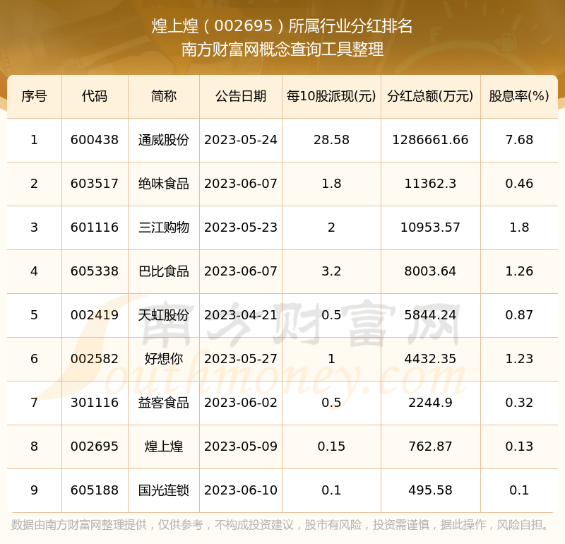 按照南方財(cái)富網(wǎng)趨勢選股系統(tǒng)統(tǒng)計(jì),煌上煌所屬行業(yè)為食品行業(yè),食品行業(yè)分紅排名情況如下表: