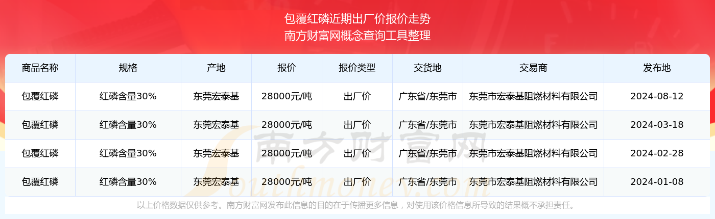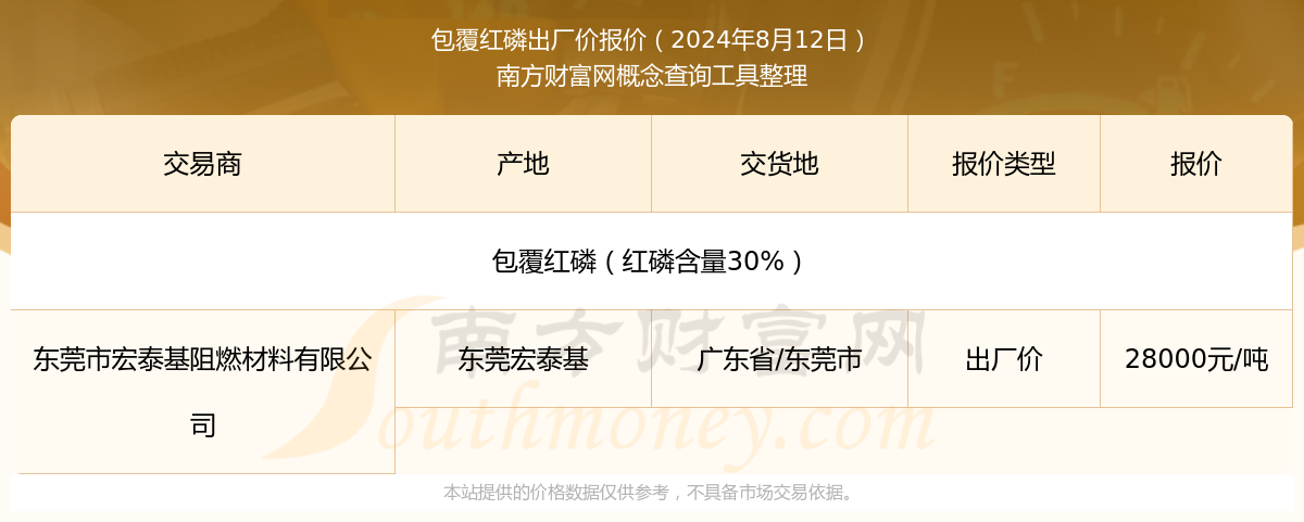 2024年8月12日,包覆紅磷(紅磷含量30%)出廠價價格為28000.00元/噸,報價人:東莞市宏泰基阻燃材料有限公司,交易地點為廣東省/東莞市。