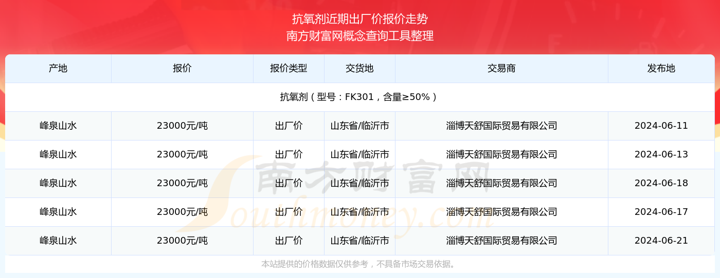 2024年6月21日,淄博天舒國(guó)際貿(mào)易有限公司抗氧劑(型號(hào):FK301,含量≥50%),峰泉山水,交易地點(diǎn)為山東省/臨沂市,出廠價(jià)報(bào)價(jià)為23000.00元/噸。