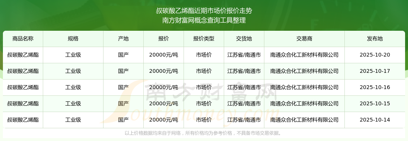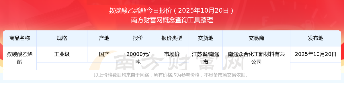 2025年10月20日叔碳酸乙烯酯市場(chǎng)價(jià)報(bào)價(jià)查詢(xún)