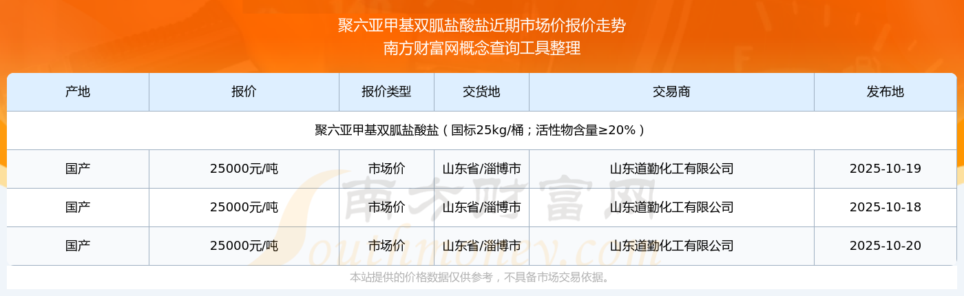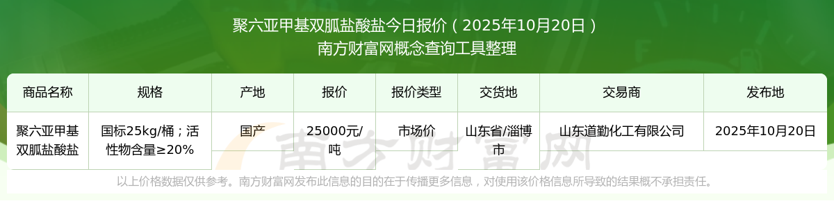 2025年10月20日,聚六亞甲基雙胍鹽酸鹽(國標(biāo)25kg/桶;活性物含量≥20%)市場價價格為25000.00元/噸,報價人:山東道勤化工有限公司,交易地點(diǎn)為山東省/淄博市。