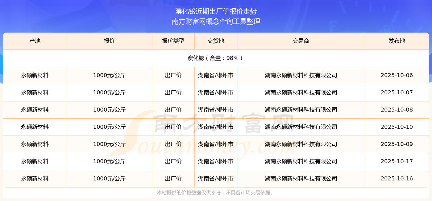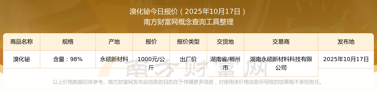 2025年10月17日,溴化鉍(含量:98%)出廠價價格為1000.00元/公斤,報價人:湖南永碩新材料科技有限公司,交易地點為湖南省/郴州市。