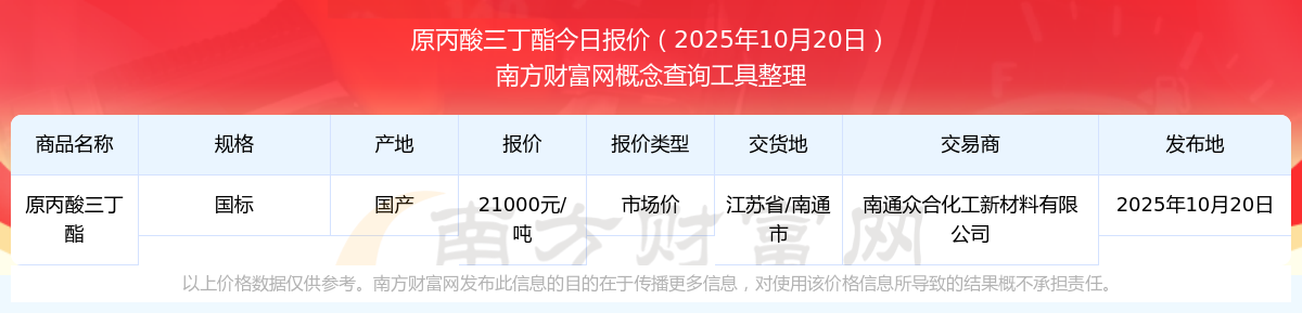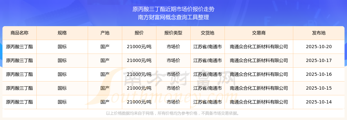 2025年10月20日,南通眾合化工新材料有限公司原丙酸三丁酯(國標(biāo)),國產(chǎn),交易地點(diǎn)為江蘇省/南通市,市場價報價為21000.00元/噸。