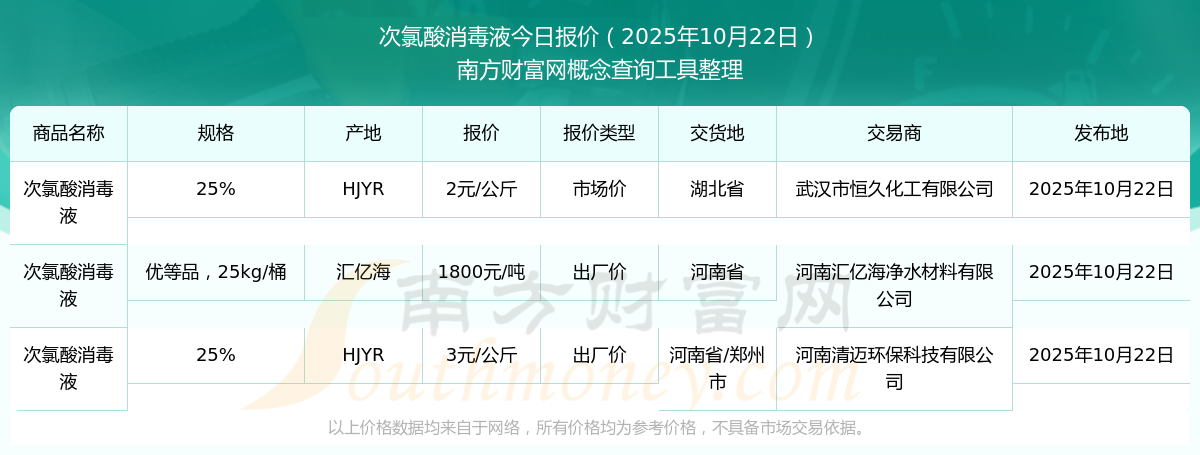 2025年10月22日,次氯酸消毒液(25%)價格為2.00元/公斤,報價人:武漢市恒久化工有限公司,交易地點為湖北省。