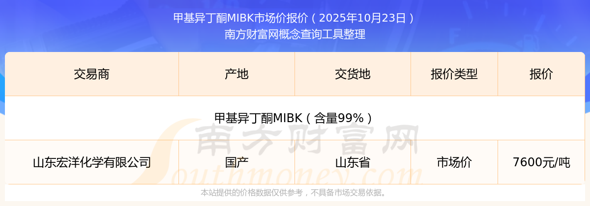 2025年10月23日,甲基異丁酮MIBK(含量99%)市場(chǎng)價(jià)價(jià)格為7600.00元/噸,報(bào)價(jià)人:山東宏洋化學(xué)有限公司,交易地點(diǎn)為山東省。