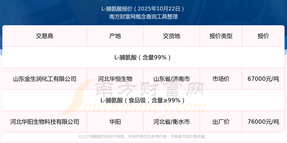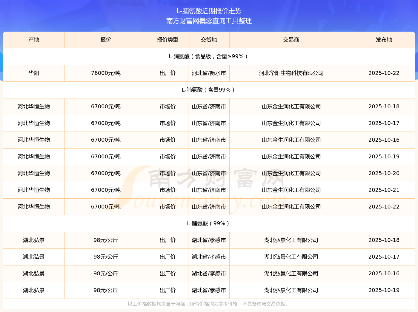 2025年10月22日,山東金生潤化工有限公司 L-脯氨酸(含量99%),河北華恒生物,交易地點(diǎn)為山東省/濟(jì)南市,報價為67000.00元/噸。