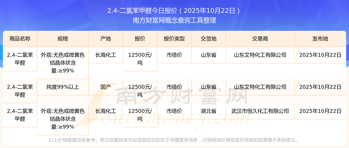 2025年10月22日,2,4-二氯苯甲醛(外觀:無色或微黃色結(jié)晶體狀含量:≥99%)市場價價格為12500.00元/噸,報價人:山東艾特化工有限公司,交易地點為山東省。