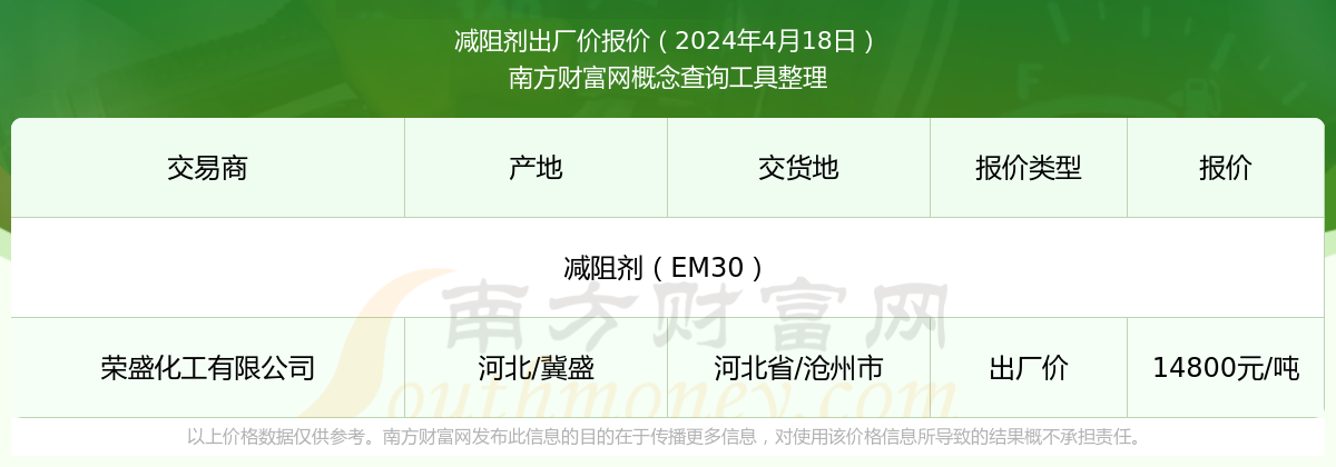 2024年4月18日,減阻劑(EM30)出廠價(jià)價(jià)格為14800.00元/噸,報(bào)價(jià)人:榮盛化工有限公司,交易地點(diǎn)為河北省/滄州市。