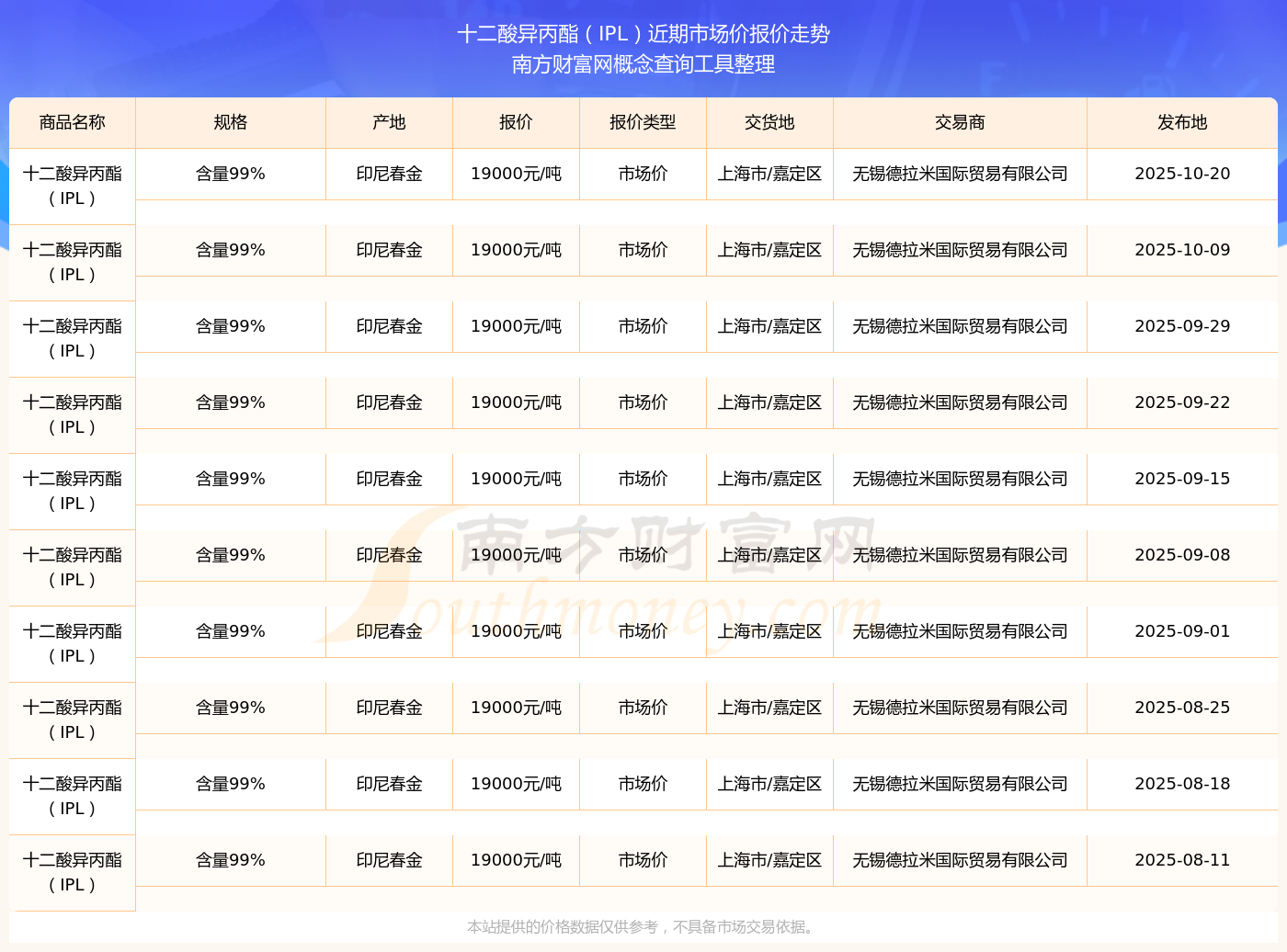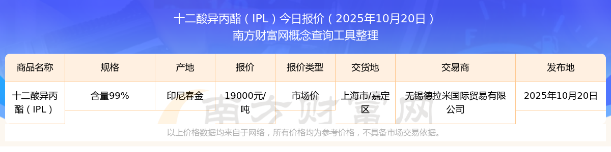 2025年10月20日十二酸異丙酯(IPL)市場價報價詳情一覽表