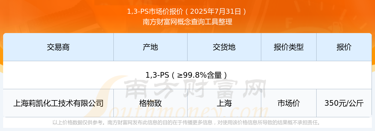 2025年7月31日,上海莉凱化工技術(shù)有限公司1,3-PS(≥99.8%含量),格物致,交易地點(diǎn)為上海,市場價(jià)報(bào)價(jià)為350.00元/公斤。