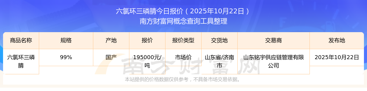 2025年10月22日,山東銘宇供應(yīng)鏈管理有限公司六氯環(huán)三磷腈(99%),國(guó)產(chǎn),交易地點(diǎn)為山東省/濟(jì)南市,市場(chǎng)價(jià)報(bào)價(jià)為195000.00元/噸。