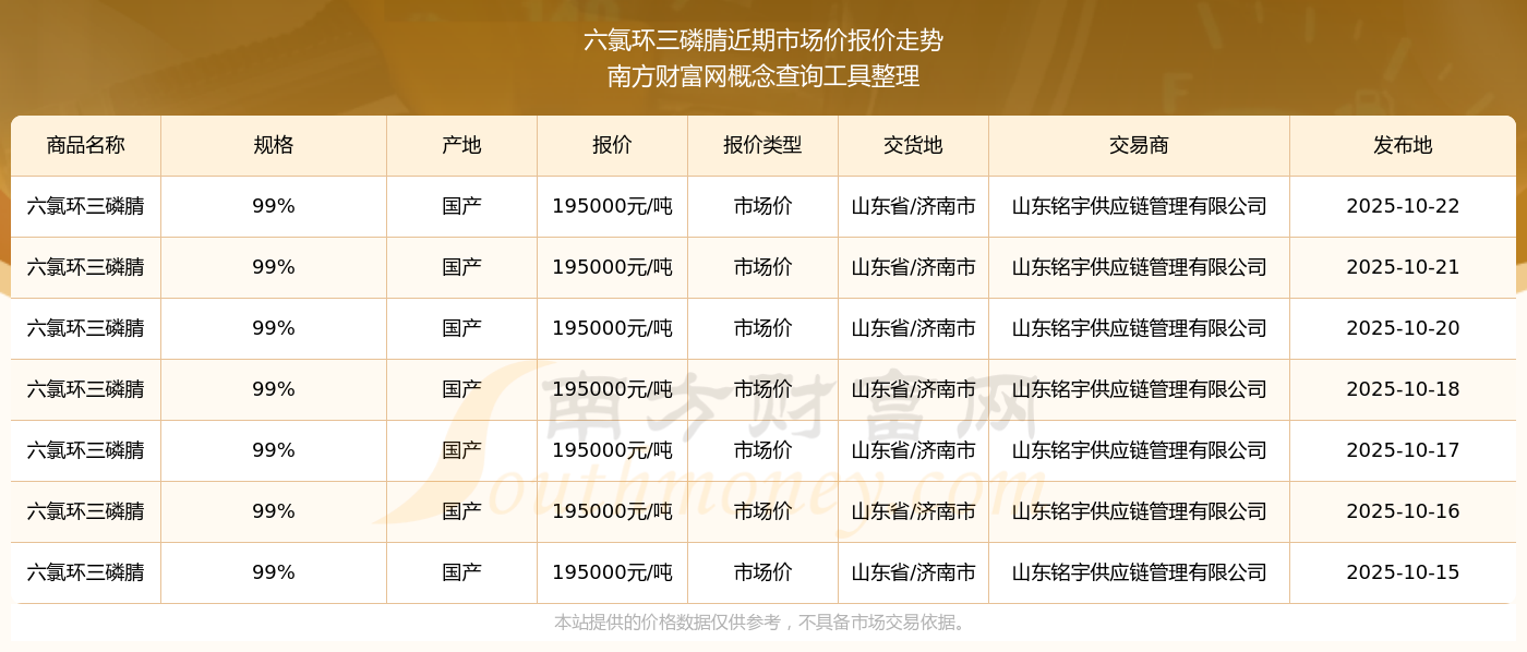 2025年10月22日六氯環(huán)三磷腈市場(chǎng)價(jià)報(bào)價(jià)查詢及近期市場(chǎng)價(jià)報(bào)價(jià)走勢(shì)