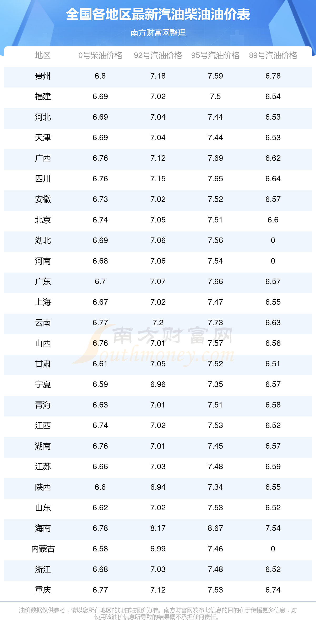 以上數(shù)據(jù)僅供參考,請以您所在地區(qū)的加油站實際售價為準。南方財富網(wǎng)發(fā)布此信息的目的在于傳播更多信息,對使用該油價信息所導致的結(jié)果概不承擔責任。