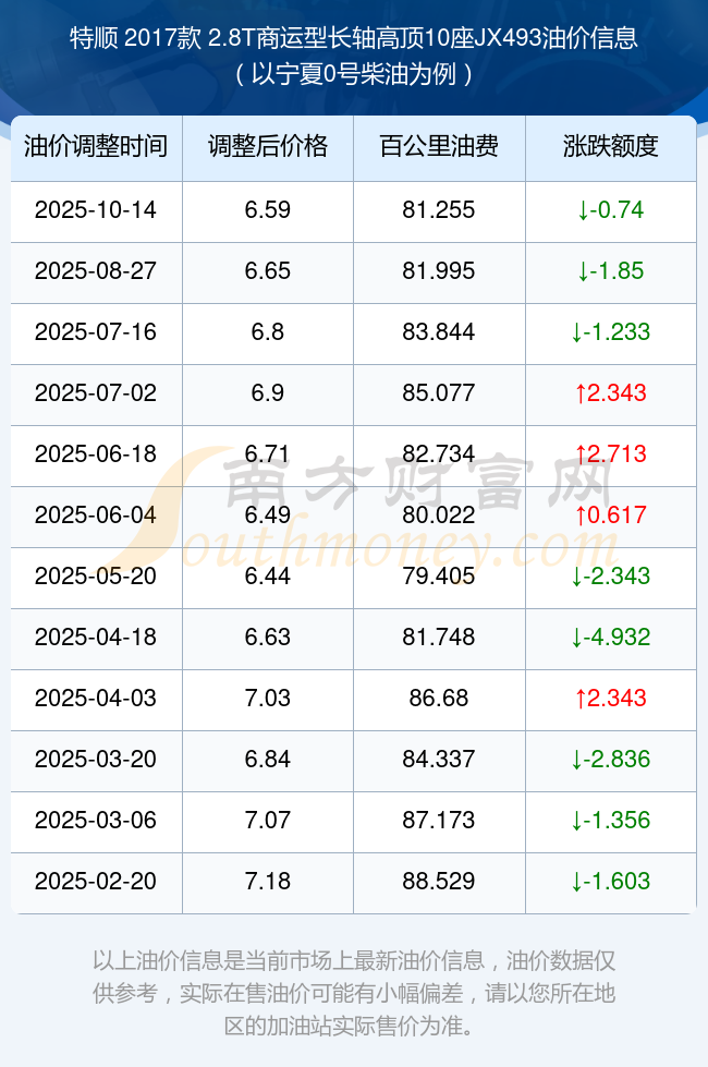 按照10月14日0號柴油最新調整價格6.59元/升來計算(以寧夏為例),該車型百公里平均油費為81.255元,按照上一輪8月27日調整價格6.65元/升來計算,百公里平均油費為81.995元,對比上一輪少花0.74元,下一輪油價調整時間為10月27日24時。