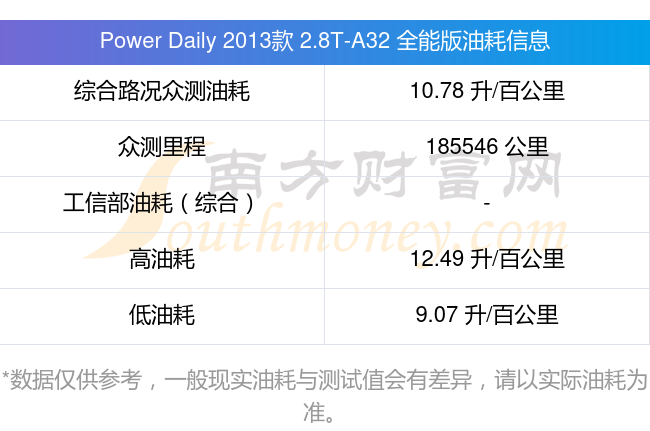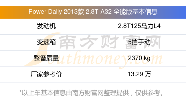 Power Daily 2013款 2.8T-A32 全能版動(dòng)力上配備的是一臺(tái)2.8T125馬力L4渦輪增壓發(fā)動(dòng)機(jī),匹配的是5擋手動(dòng)擋變速箱,燃料形式為柴油,常規(guī)整備質(zhì)量2370kg,廠家參考價(jià)13.29萬(wàn)元。