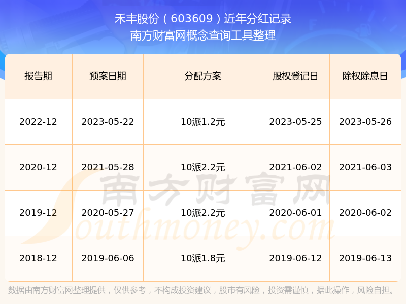 禾豐股份最新一次公布的分紅方案為10派1.2元。本次權益分派股權登記日為2023年5月25日,除權除息日為2023年5月26日,派息日為2023年5月26日。